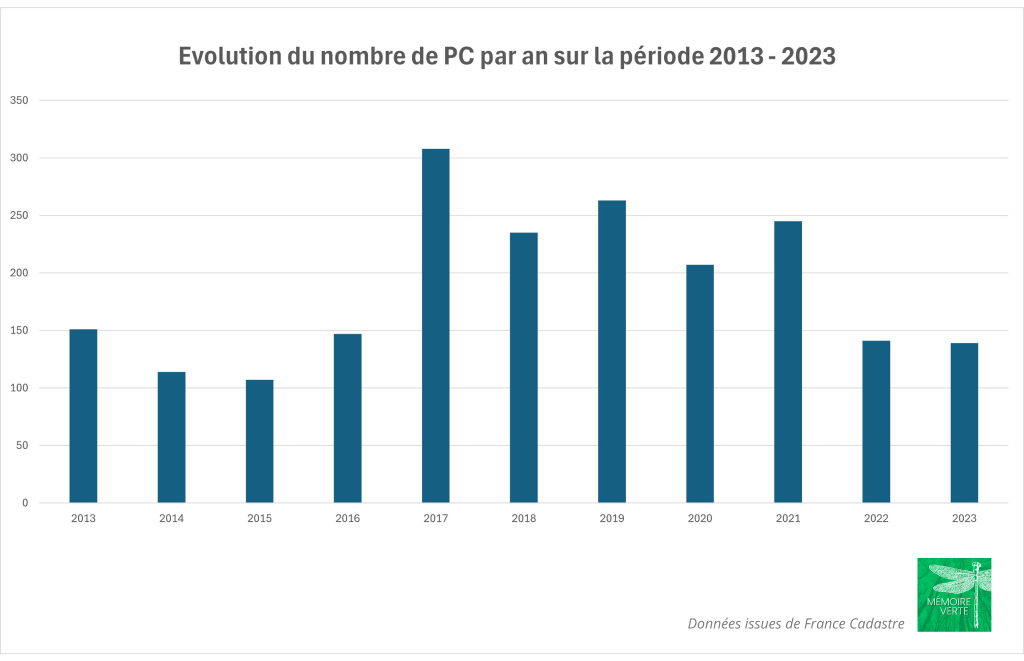 Comme on peut le voir ci-dessus, le nombre de permis de construire délivrés chaque année est en baisse depuis le pic de 2017.